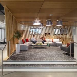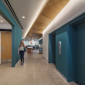 The first phase was completed in May 2023, and the final phase was delivered by the end of November 2023. The architect for the project was Acquilano Interior Architecture, and E & K of Denver served as the installer. ASI Architectural provided production drawings for the ceiling panels and standard details to support their installation in the field. The Fusion Flat Ceiling system covered 7,776 square feet and consisted of 628 ceiling panels, each measuring 24” x 72”. These panels were installed using a torsion spring system that securely attaches to the T-bar grid system, allowing easy removal for access above the ceiling. The material used for the panels was Class A fire-rated particleboard core with a white oak rift-cut face and edges, finished with a clear lacquer.