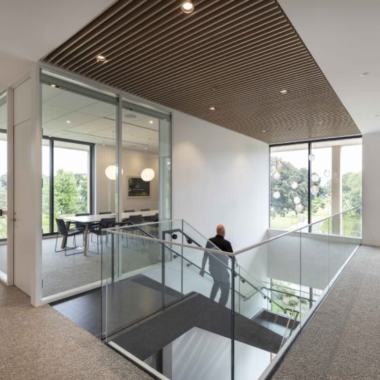 The headquarters features open offices, a lobby, training zone, work café, call center, and fitness center, all connected by a striking five-floor stairwell. Designed for comfort and collaboration, it incorporates sit-to-stand desks, natural materials, and environmental branding, reinforcing Landmark’s commitment to its employees and customers.