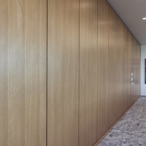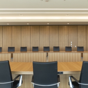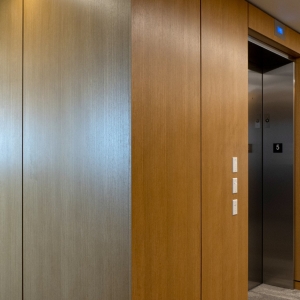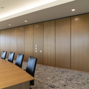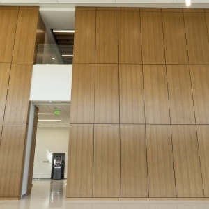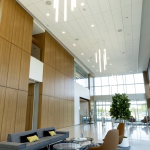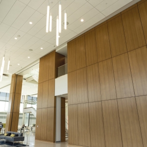 ASI Architectural’s microperf wall panels in quartered eucalyptus, custom stained to enhance uniformity, can be seen throughout Landmark Credit Union’s new headquarters, enriching the conference room, lobby, and hallways. The conference room features wall panels seamlessly integrating a hidden door, while in the hallways, our microperf panels wrap around the walls to accommodate the elevator cutouts. In the lobby, a stunning two-story wall panel installation showcases our precision craftsmanship, ensuring a flawless wrap from front to back. The scale and complexity of this project make it a true testament to ASI Architectural’s expertise.