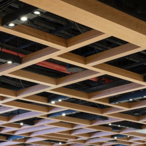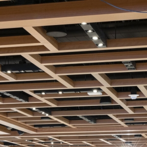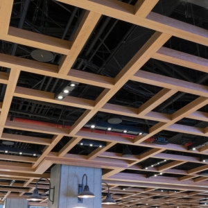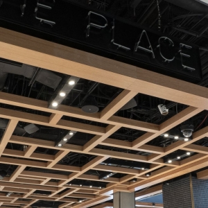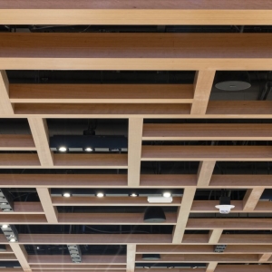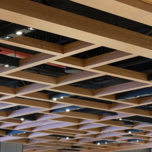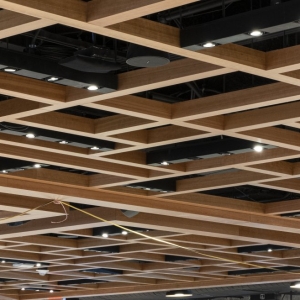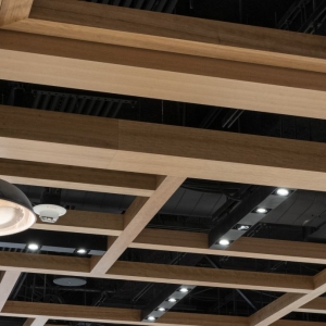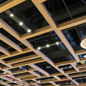 At first, the project’s complexity posed a challenge to ASI Architectural. However, through extensive preplanning and coordination, ASI’s team of project managers, designers, and operators developed a detailed plan for execution. The beams, crafted from Class A Fire Rated MDF boards and finished with clear lacquer on rift-cut Cherry veneer, added warmth and elegance while concealing seams with a uniform grain structure. Lighting was seamlessly integrated into the beam layout, adding another layer of complexity to the design.