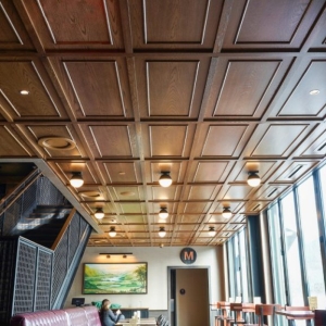 ASI Architectural contributed to the project’s rich interior with 1,875 square feet of Modern Coffer ceiling systems, featuring coffer panels with applied mounting in a PS White Oak wood veneer. Several panels were field-cut on site for tailored customization. Additionally, ASI provided 1,108 square feet of StrandTec Direct Attach panels with beveled edges and a custom finish, offering a seamless blend of acoustic performance and refined aesthetic throughout the space.