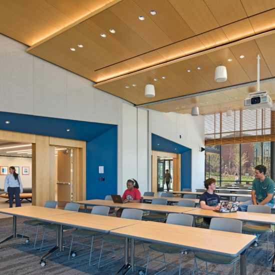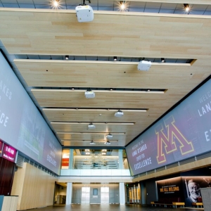 For the University of Minnesota’s premier Athletes Village, ASI Architectural was tasked with creating two distinct environments to support its top-tier athletic programs. In the expansive main lobby, we provided nearly 6,300 square feet of our Audition 8 T&G ceiling planks finished in a bright maple veneer to create a light and airy atmosphere. To precisely match the architect’s vision, we engineered a custom groove and perforation pattern, delivering a bespoke acoustic solution that feels both open and grand.