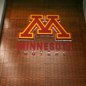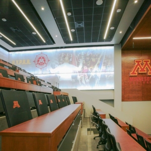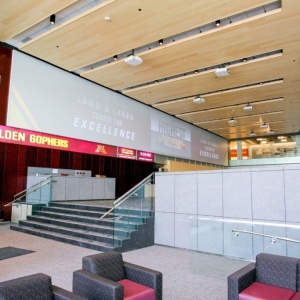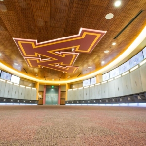 In contrast, the locker and meeting rooms required a feeling of warmth and professionalism. Here, we supplied nearly 2,400 square feet of our Fusion panels in a rich cherry veneer. These panels featured a custom oval slotted perforation pattern, engineered to increase acoustical performance in these critical spaces, and were further customized with integrated University of Minnesota logos, seamlessly blending school pride with sophisticated design.